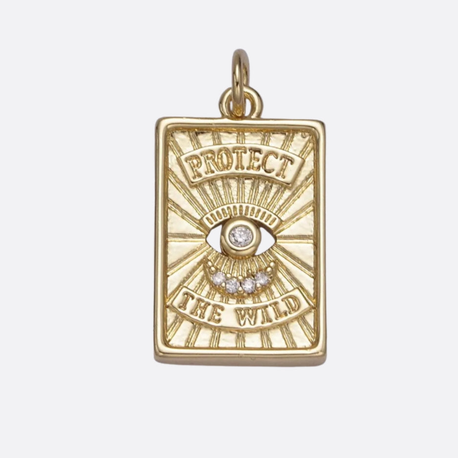 This golden rectangular charm features an engraved all-seeing eye beaming with celestial rays and the words “Protect the Wild.”